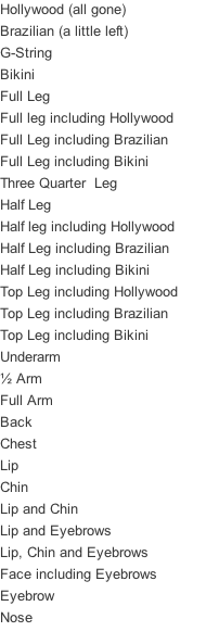 A wide selection of waxing treatments are available at the salon. Waxing is an effective method of removing unwanted hair in both large and small areas.